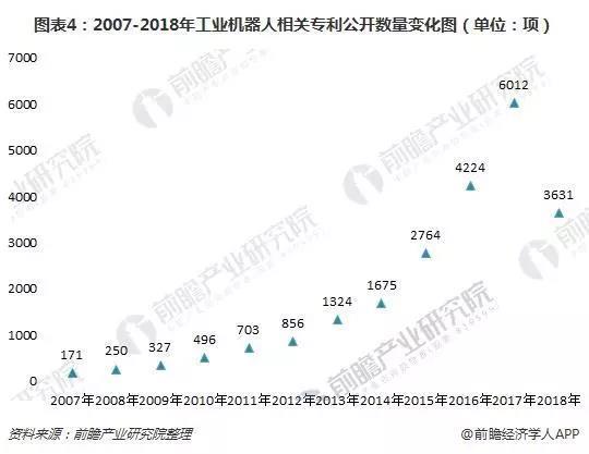 從公開專利數(shù)量來看,2007-2017年,我國工業(yè)機(jī)器人專利公開數(shù)量總體上呈趨勢(shì)。2017年,我國工業(yè)機(jī)器人專利公開數(shù)量為6012項(xiàng),達(dá)到近年來最大值;截至2018年6月,專利公開數(shù)量為3631項(xiàng)。