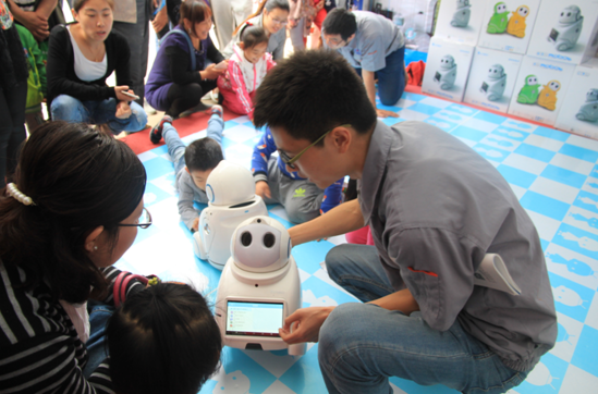 我公司員工向參觀觀眾詳細講解公司的小優(yōu)機器人的功能特點