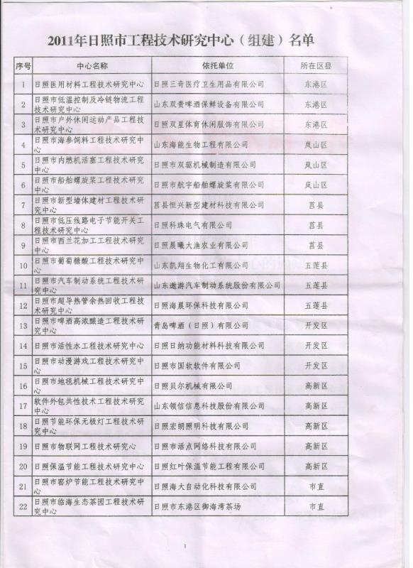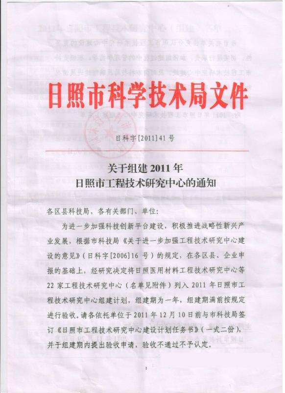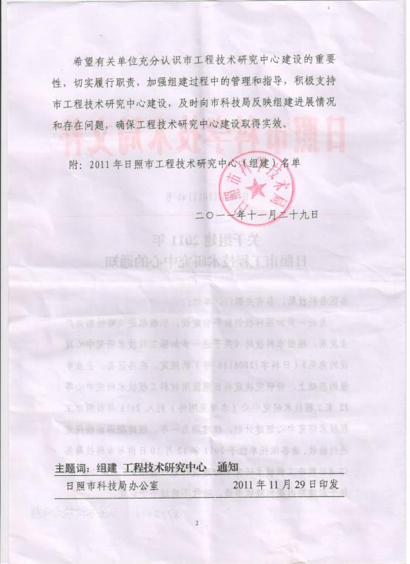 2011年11月為了進一步加強科技創(chuàng)新平臺建設(shè),積極推進戰(zhàn)略性新興產(chǎn)業(yè)發(fā)展,日照市科技局辦公室發(fā)出了《關(guān)于組建2011年日照市工程技術(shù)研究中心的通知》,我公司的日照市窯爐節(jié)能工程技術(shù)研究中心被列入《2011年日照市工程技術(shù)研究中心(組建)名單》。